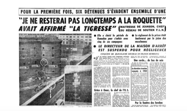 Six détenues de la prison de La Roquette se sont évadées dans la nuit de jeudi à vendredi. Il s’agit de trois métropolitaines : Micheline Pouteau, Hélène Cuenat, Joséphine Carré, condamnées lors du procès du réseau Jeanson, le 1er octobre 1960, les deux premières à dix ans de prison, la troisième à cinq ans de la même peine ; de deux Algériennes : Fatima Hamoud, condamnée à cinq ans de prison en mars 1960 par le tribunal militaire, et Zina Haraigne, inculpée d’atteinte à la sûreté intérieure de l’État, en instance de jugement, et d’une Égyptienne, Eliane Rossario (sic), inculpée d’atteinte à l’intégrité du territoire, en prévention. C’est vers 6 h. 30, vendredi matin, que l’évasion a été découverte. Les six jeunes femmes, qui se trouvaient dans la même cellule, ont scié un des cinq barreaux de la fenêtre, et à l’aide d’une corde faite de lambeaux d’étoffe torsadés, ont gagné 8 mètres plus bas la cour de la prison. Puis, au moyen d’une échelle de jardinier, croit-on, elles ont franchi l’enceinte extérieure du côté de la rue Merlin. Le directeur de la prison a été suspendu de ses fonctions.