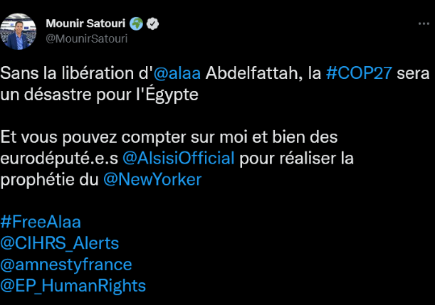 L’eurodéputé français Mounir Satouri a écrit avec force sur Twitter, en se référant à ce récent article sur Alaa dans le New Yorker :